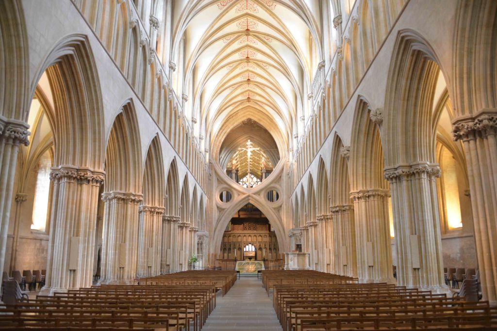 La Cathédrale Saint-André de Wells est la première cathédrale anglaise construite dans le style gothique (1230). La vue sur l’édifice est dégagée. Sur la façade vous pourrez observer la plus grande galerie (au monde) de statues de rois, d’évêques, d’anges, d’apôtres, prophètes. L’architecture intérieure est tout autant spectaculaire, à cause notamment de l’unique (au monde) voûte en ciseaux de la nef.